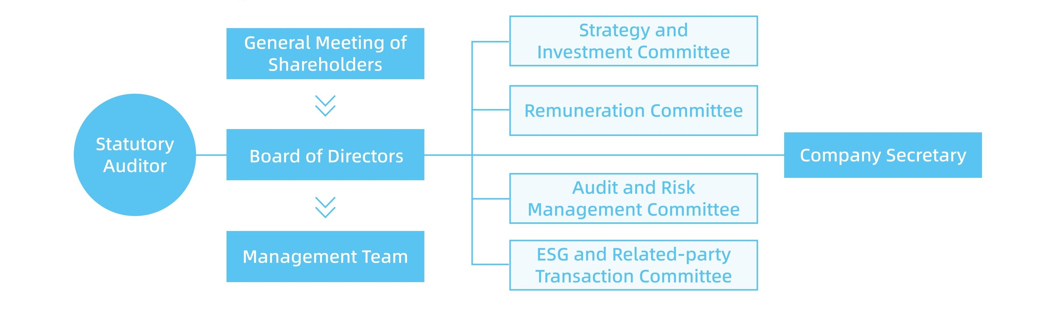 We continuously refine our corporate governance?structure and enhance the operational efficiency of the?Board of Directors, laying a solid foundation for the?Company's sustainable development. Our governance?structure aligns with global industry leaders and?is based on internationally recognized corporate?governance principles. It emphasizes independence,?transparency, diversity, and accountability, ensuring?that all activities are managed in accordance with the?Company's vision, mission and values.