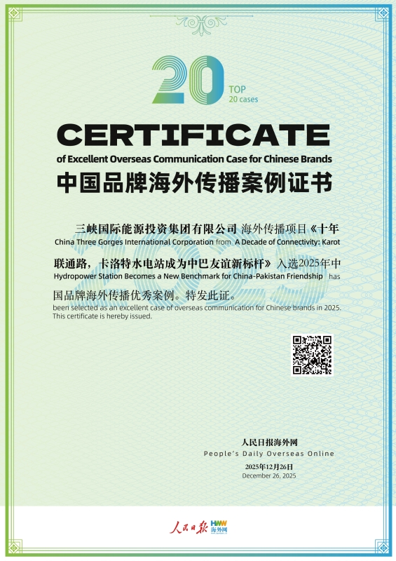 12月26日,由人民日報海外網主辦的“2025中國品牌海外傳播優秀案例”評選結果揭曉,三峽國際申報的《十年聯通路,卡洛特水電站成為中巴友誼新標桿》案例成功入選。該案例系統闡述了卡洛特水電站作為“一帶一路”旗艦項目,在建設運營過程中,如何通過聚焦“高質量、可持續、惠民生、跨文化”四大維度,深化“硬聯通”、推動“軟聯通”、促進“心相通”,成功塑造了可信、可愛、可敬的中國企業形象,為中國品牌海外傳播提供了可驗證、可參考、可推廣的實踐路徑。